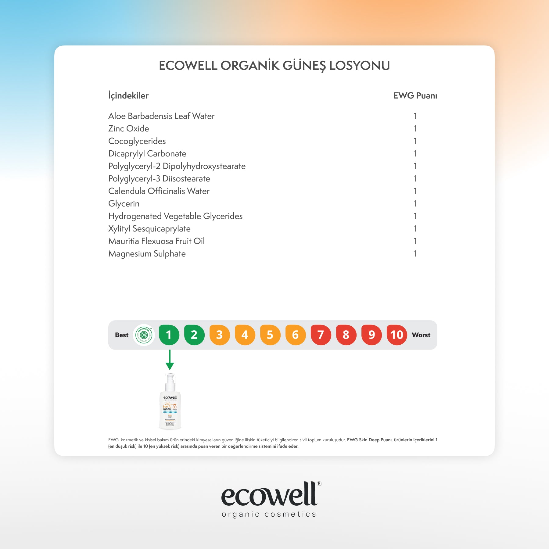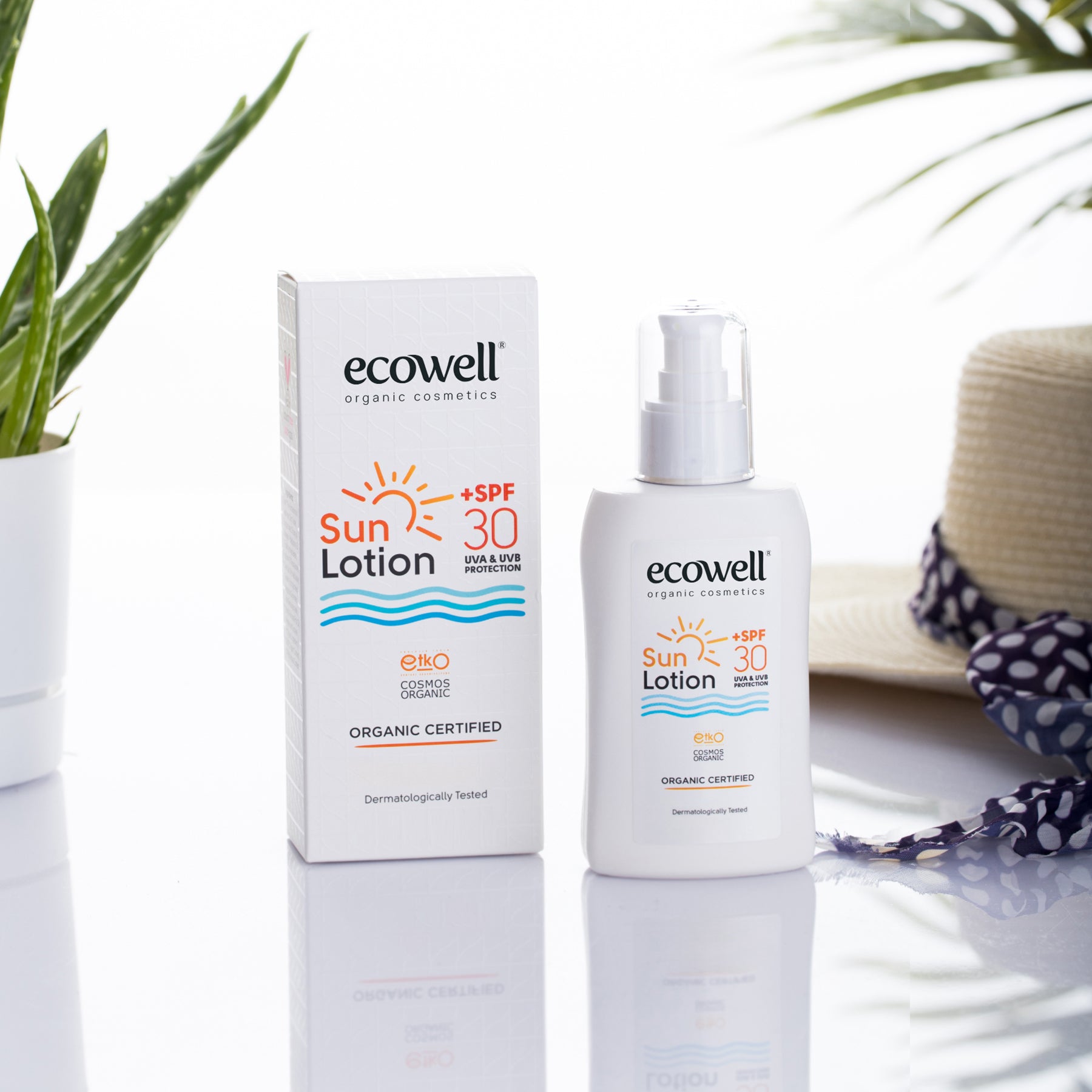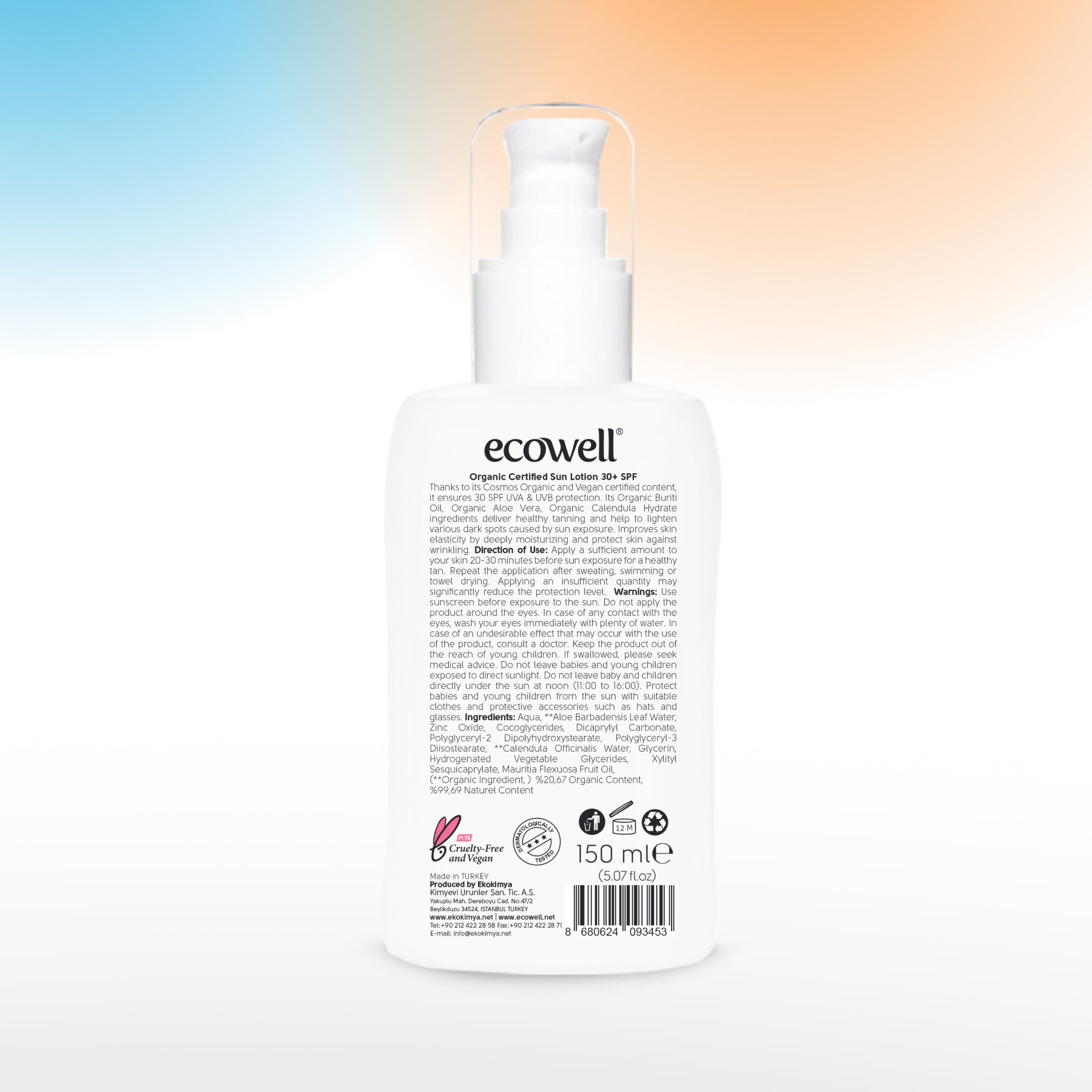 La lotion solaire bio Ecowell, à base d'huile de buriti, d'aloe vera et de calendula biologiques, protège votre peau des effets néfastes du soleil, notamment des coups de soleil, des imperfections et du vieillissement prématuré, et favorise un bronzage éclatant. Elle hydrate et améliore l'élasticité de la peau. Sa texture douce et onctueuse facilite son application.