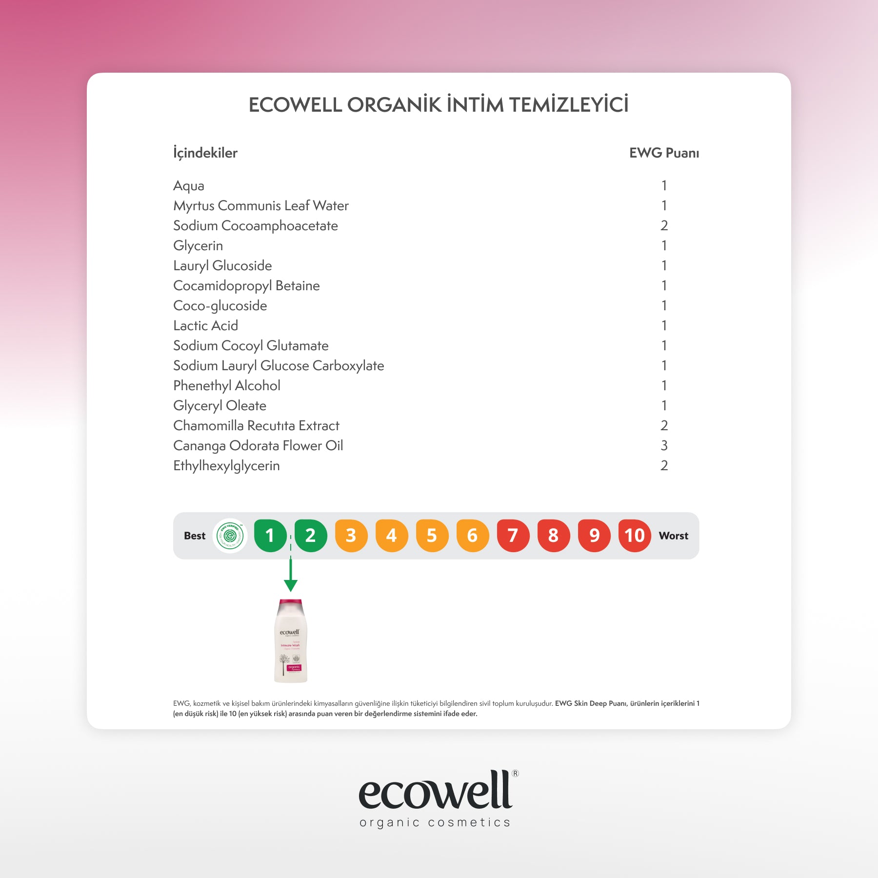 Le nettoyant intime bio Ecowell est spécialement conçu pour tous les types de peau, y compris les peaux sensibles, grasses et sèches. L'eau de myrte bio, aux puissantes propriétés purifiantes, rafraîchit et régénère la peau. L'extrait de camomille bio nettoie et apaise la zone intime en douceur sans l'agresser. Il aide à prévenir les mauvaises odeurs au niveau des parties génitales. Il convient aussi bien aux hommes qu'aux femmes.